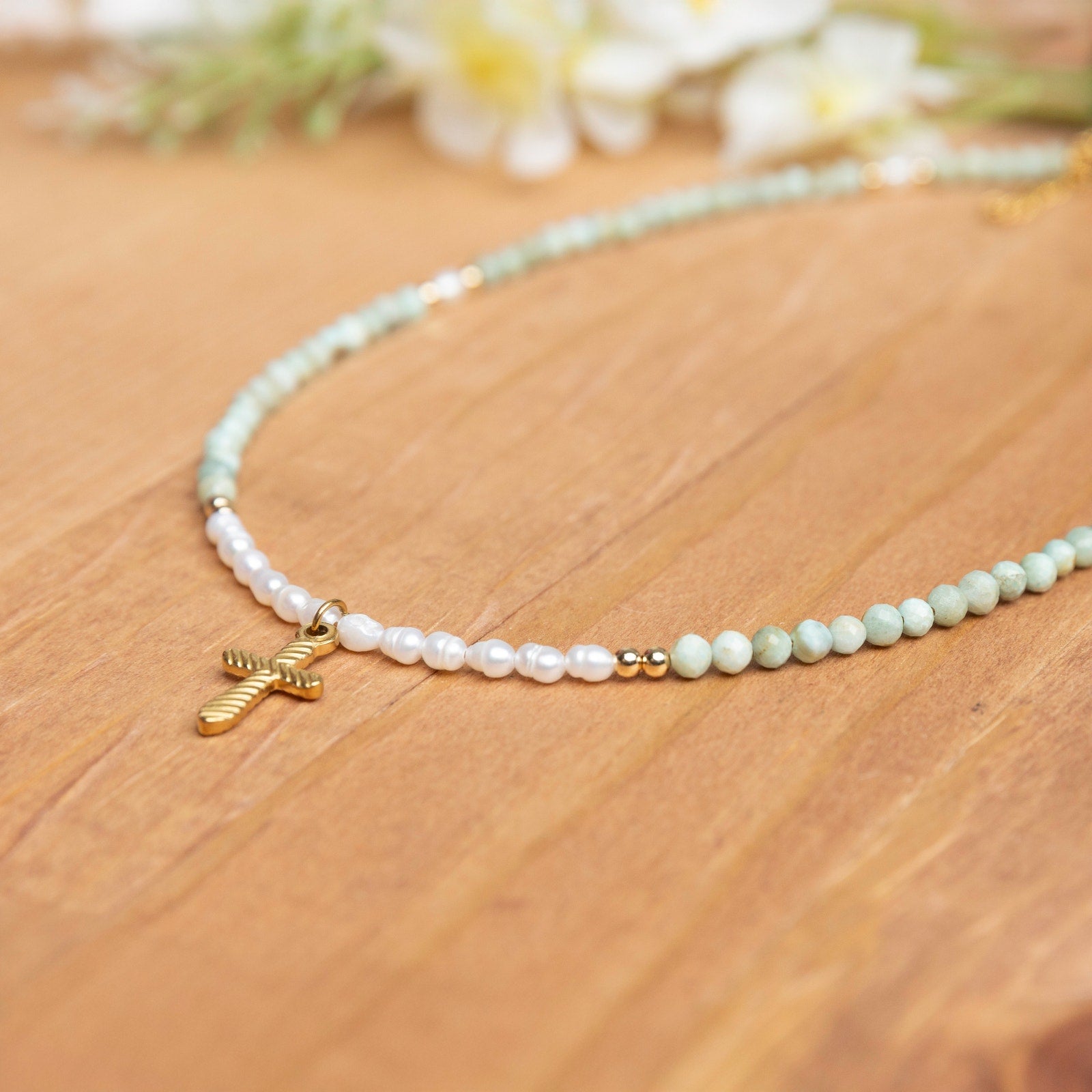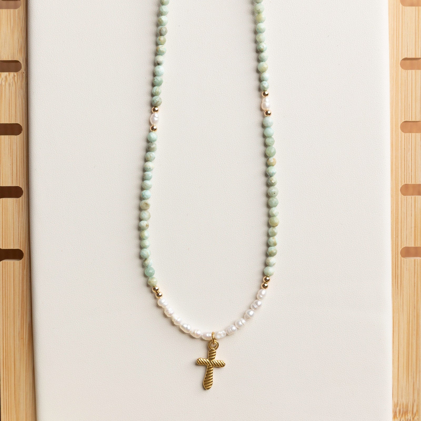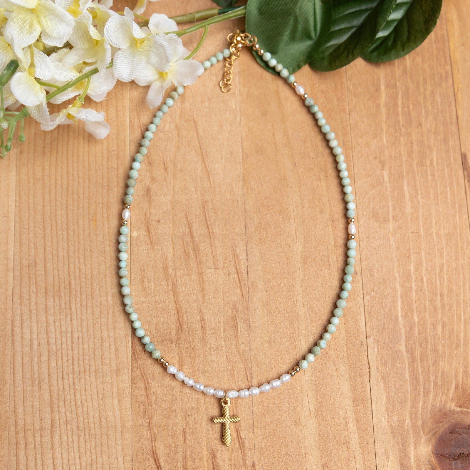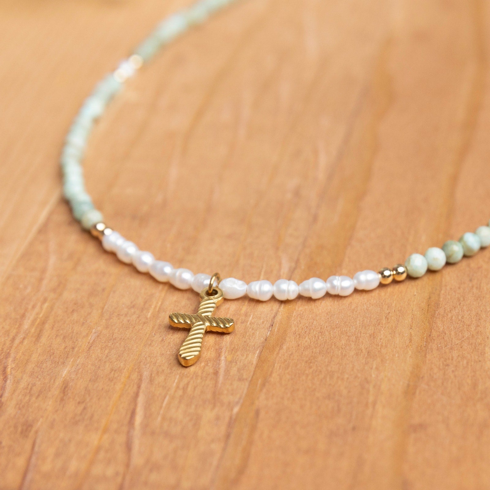 This delicate handmade necklace combines the soft elegance of Amazonite beads with the timeless beauty of freshwater pearls. Accented by gold filled beads for a subtle shimmer, the centerpiece features a gold plated cross charm that adds a meaningful touch.