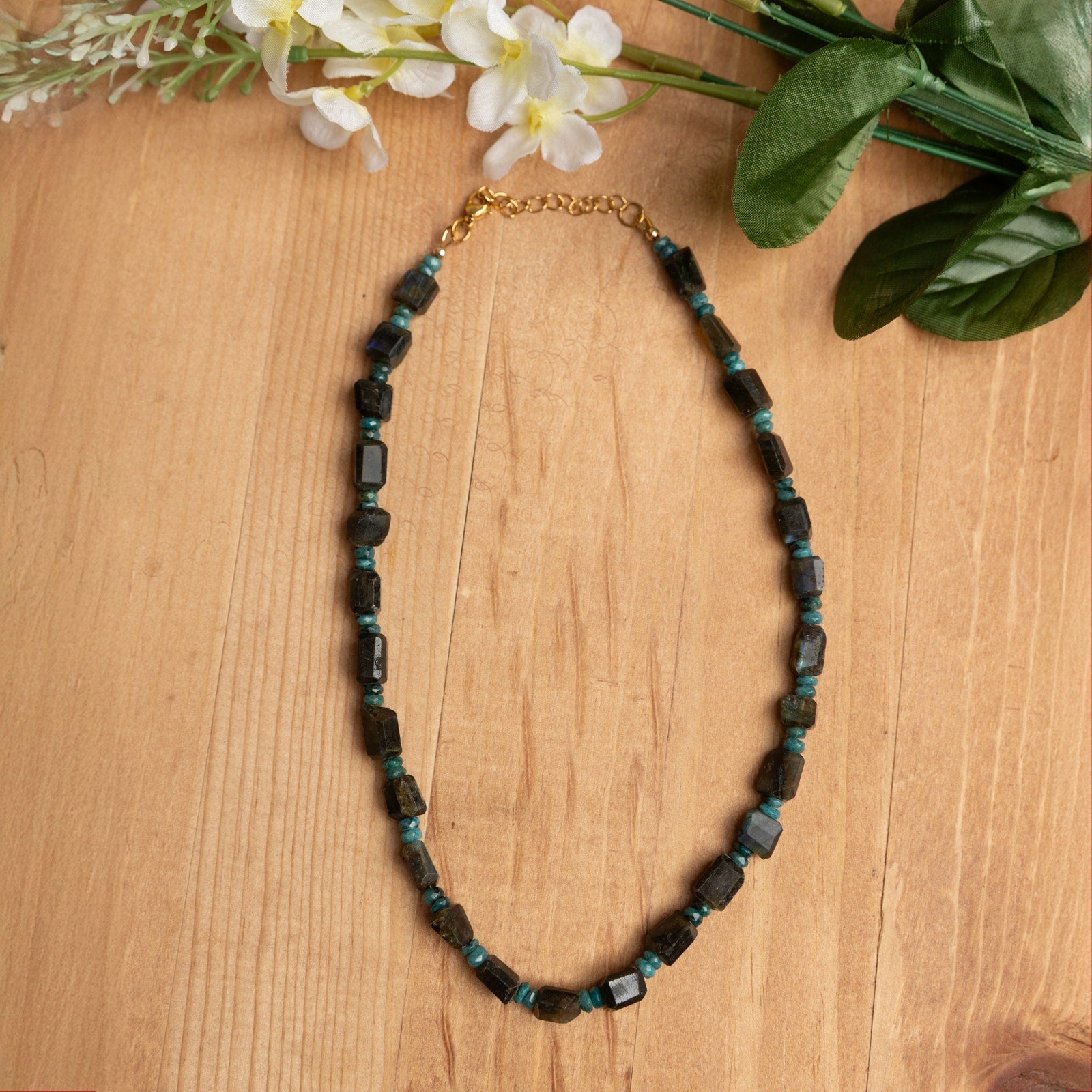 his stunning necklace pairs the mesmerizing shimmer of Labradorite with the vibrant teal sparkle of faceted Chrysocolla. Each Labradorite bead flashes with subtle iridescence, while the faceted Chrysocolla adds a touch of brightness and contrast — creating a piece that’s both earthy and elegant.